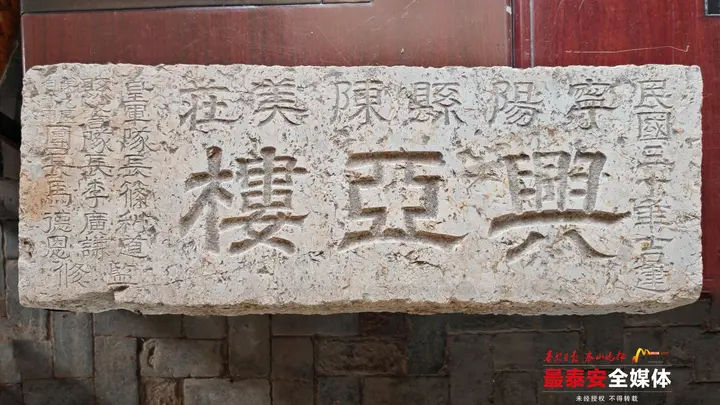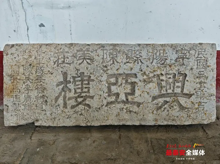8月14日,在宁阳县东庄镇陈美庄村委会,记者见到了这块长90厘米、宽35厘米、厚7厘米的石刻,上面清晰印着“宁阳县东庄镇陈美庄兴亚楼,皇军队长筱利道,县警队长李广谦、第9区自卫团团长马德恩监修”字样,石刻保存完整,字迹清晰,落款是民国三十年。